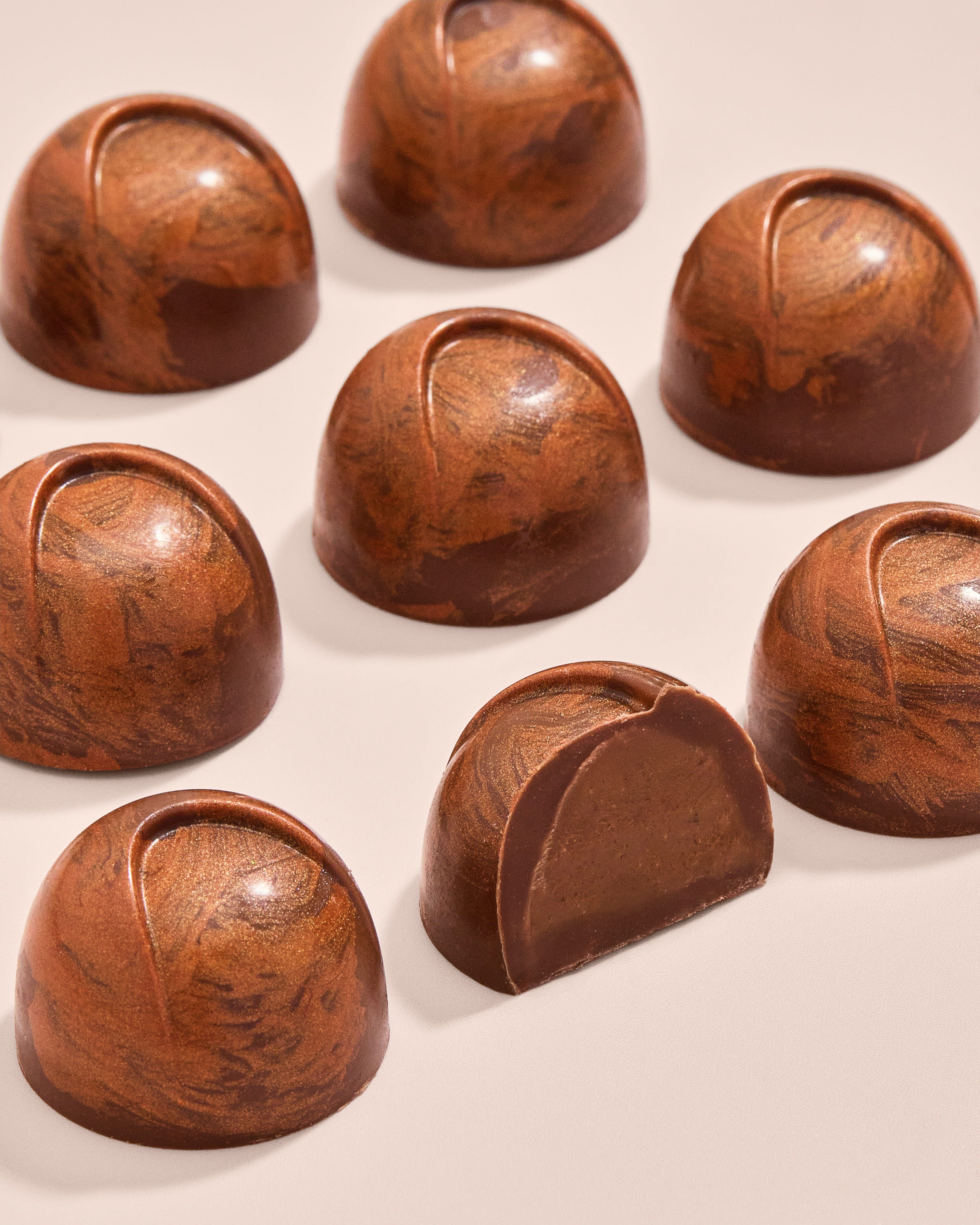 A comforting dark chocolate bonbon filled with a generous hazelnut centre. Made with hazelnut praline and hazelnut paste, this bonbon delivers deep roasted nut flavours with a naturally rich and lingering finish.
