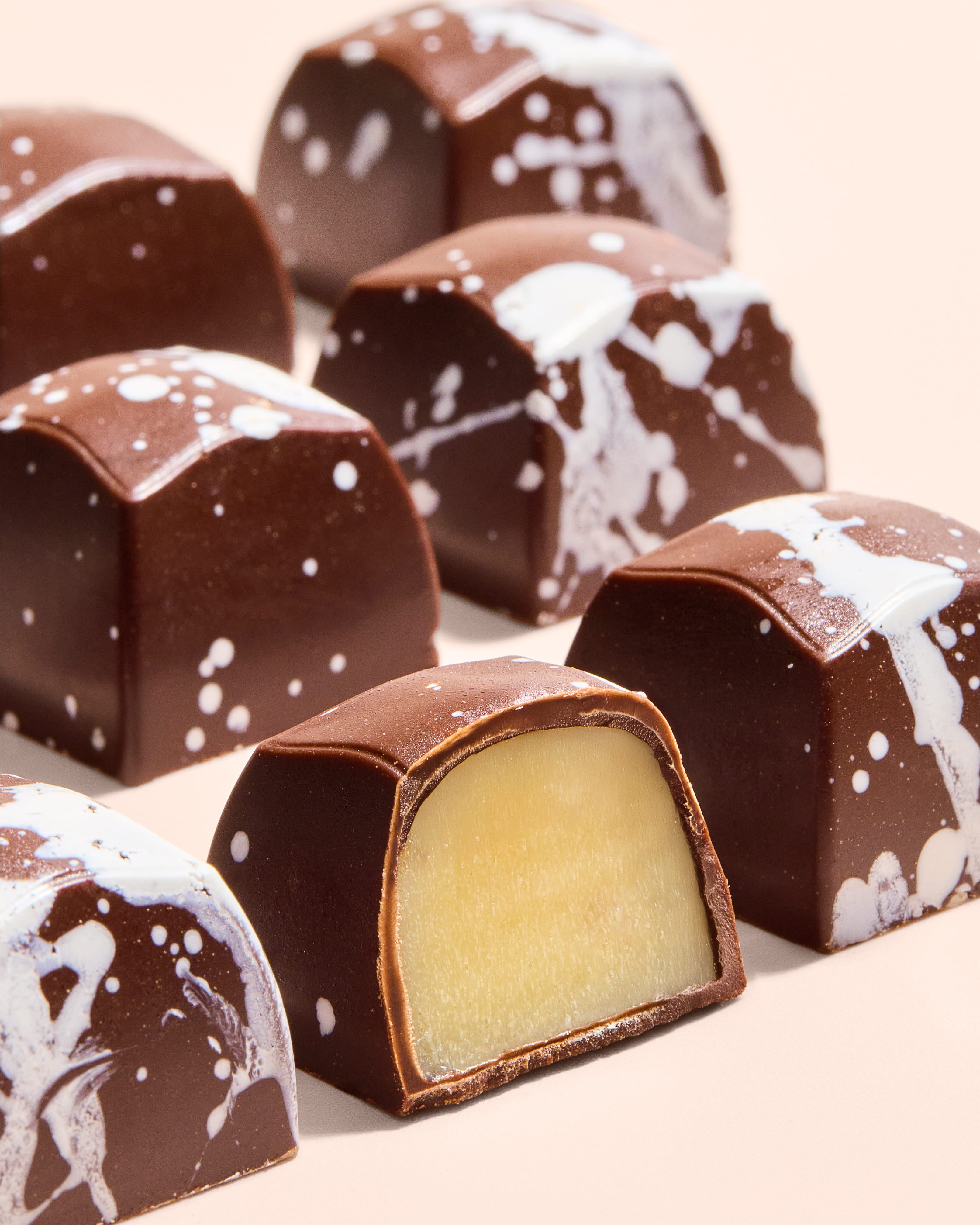 A smooth and elegant dark chocolate bonbon with a creamy vanilla and white chocolate centre. The filling is soft and velvety, with gentle vanilla notes that add warmth and sweetness without overpowering. Encased in a rich dark chocolate shell, this bonbon offers a refined balance of creamy sweetness and deep cocoa flavour, finishing clean and delicate on the palate.